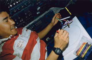 Aの方は、サインと並んで「MET 8/12:00」とあるように、第1回船外活動後の飛行8日目に、ミッドデッキで描かれた。土井氏によれば「二時間では描ききれなくて、三時間近くかけて一気に描いた」ということである。 インタヴューのなかで、宇宙空間でこうした描画行為を行った個人的な印象をたずねたところ、「楽しかった。絵を描くというのは、写真を撮るのとちがって、より自分を積極的に表現できる。描いているときもリラックスできて楽しかったという記憶がある」ということであった。単なる鑑賞や記録ではなく、一定時間を費やす創作活動が持つ意義をあらためて示唆する貴重な証言である。 また「三時間近くかけて絵を描いているときにほかのクルーとのやりとりはなかったか」という問いに対し、土井氏は、「大きなスペースを占有するわけではなく、自分一人で取り組んでいる行為に対して、ほかの乗組員はなんら干渉しない。自分の個人的な時間は自由に使える」と答えた。つまり船内の活動スケジュール、とりわけ自由時間の設定は、厳密に決定されているのではなく、比較的フレキシブルに組換え可能である。今後何らかの芸術ミッションを構想する場合も、取り組む時間は固定的にではなく、行為者の意志や条件に応じて柔軟に設定される必要がある。 (2)空間感覚と身体性 時間的側面と並んで意外だったのは、2点の絵画とも、地上で描かれたのと変わらない安定した空間性を示していることであった。会見での発言によれば、土井飛行士は、「身体を固定しないで宙に浮いた状態で、食事用トレイをマジックテープでひざに固定し、それを画板がわりにした。その上に、紙を数枚束ねて厚紙にゴムバンドで留めたものを固定して描いた」という。微少重力下での描画には、それだけの工夫を要したということだ。 会見中、もっとも興味深い話の一つは、空間の参照軸(reference axis)に関するものであった。訓練の成果でもあろうが、土井氏のみならず、Steven Nagel、 Linda Godwin両氏の証言にもあるように、フライトの最初の2日ほどのあいだは上下の方向感覚が混乱するが、その後は適応して、意識的に身体の垂直軸を変換できるということである。つまり、天井や床といった空間の先験的な規定から比較的自由に、頭方向を上、足方向を下というふうに、身体に内在する上下の軸性にもとづいて、そのつど空間のフレームを意識的に組み換えることができるのである。 興味深いのは、その際に身体の垂直軸が水平軸よりも優先することだ。土井氏によれば、船外に出た場合も足元の貨物室の方向が下として意識され、地球に向かって上方に落ちていくような気になることはまずないということであった。身体が意識されにくい眠りの状態のとき、両眼のうしろに意識だけが浮いているような奇妙な感覚に襲われるという興味深い証言も、覚醒状態のときの身体の上下の軸性の意識が安定した空間体験の要であることをよく示している。 絵画を考えるとき、地上においては水平軸が重要な要素であるのだが、微少重力空間においては、むしろ垂直軸に注目しなければならないのかもしれない。絵画実験は、いずれも土井飛行士が微小重力空間に適応し、reference axis がコントロール可能な状態になってから行われている。Bの構図が、地球を上に浮かべているにもかかわらず、きわめて安定した軸性と左右対称性を示しているのも、それを眺め、描く土井氏の身体空間の枠組がしっかりと安定しているからである。 これは、Aの実験結果にも大きく関わってくる。本来この実験は、紙を数枚つなげて身体が楽に入るほどの大きさの円を描き、それに沿って丸い紙面を作ることを第一条件としていた。そのことによって、身体の基本的動作の可能性を検証するとともに、地上でのあらゆる造形が自明の前提としている重力感覚、水平/垂直および上/下という枠組を、宇宙という新しい環境で問い直すことが問題であった。(→図解による検討) だが、配色のバランスをうまく考えながら、丁寧にすきまなく塗り分けられた画面を子細に観察すれば、描かれたプロセスとともに、図解で検討したようないくつかの興味深い考察が得られる。 Bの実験では土井氏の自由な描写が試みられた。図B3〜5は原図を回転させシャトルと土井氏の固定部分を取り去ることで、観賞者として受けるイメージがどのように変化するかを検証したものである。(→図解による検討) (3)色彩 色彩面に関しては、人為的な色彩構成を見せるAよりも、眼前に広がる宇宙の光景を前にした感動を率直に伝えるBの写生の方が興味深い。この絵からは、土井飛行士の地球に対する想いと、宇宙空間にいる、と言う感慨が伝わってくる。 「尾翼のまわりのピンク色の後光に染まったような部分は、シャトルの船体が光輝くさまを強調している」、「青い光を放って輝く地球の大気の層と白い雲、褐色の大陸、それらと漆黒の宇宙の対比を表したかった」と土井氏が言う