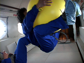 | (1) パラボリックフライトを利用して行った実験 AASは、2001年11月にパラボリックフライトによって作られる約20秒間の微小重力環境を利用したいくつかの予備実験を行いました。飛行機内のフリースペースを利用した実験では身体感覚の体験を中心に計画し、弛緩状態での浮遊体験といくつかの単純な道具と身体行為の組み合わせによる浮遊体験の比較を試みました。 この中で実施した「段ボール箱にしゃがみこんだ体勢」や「大きなゴム風船を抱えた体勢」での浮遊体験について、「体を託すものがある状態での浮遊、あるいは至近距離に体を接するものとともに浮遊することには、安心感と結びついた感覚がある。その際、身体軸を参照軸にする傾向がある。」との感想が実施者2名の共通の実感としてありました。 (Appendix: 資料1 参照) |