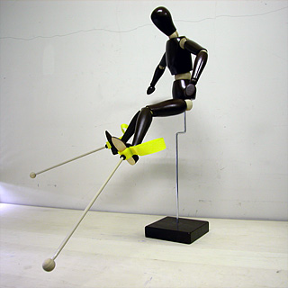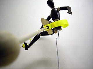 | スティック型は、両足先、両手先等にスティック上の器具を取り付けて身体の延長とする試みであり、この場合の接触対象(Blanket)は、主に船内壁を想定している。 スティック状の器具は、例えれば「レコード針」や「釣り竿」のようなものであり、ある種の触覚の拡張を使用者に付与する。また、器具の装着によって身体サイズが擬似的に大きくなる結果として、船内壁(Blanket)への接触頻度を高める。「何かに触れている」ことによって得られるsecurityな感覚が、「擬似的に延長された身体」と「接触対象としての船内壁」との関係においても形を変えて成立すれば、微小重力環境下での非接触状態からくる精神的身体的影響に何らかの効果を与える可能性があると考えている。 現在は、模型による構想の段階にとどまっている。 |