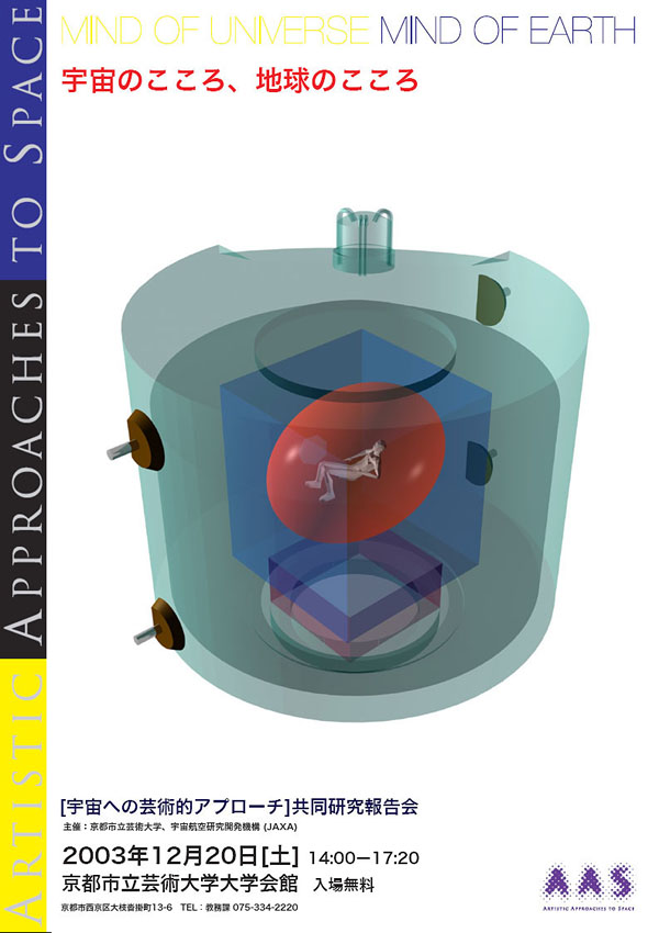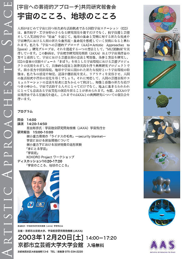 告会となった。 日時・場所: 2003年12月20日 14:00より 京都市立芸術大学大学会館ホールにて JAXA からのゲスト: 星出,吉富,清水,荒木,浜田,谷垣 (敬称略) 発表者: 星出,AAS メンバーおよび共同研究協力者,音楽学部学生(チェロ演奏) 参加者: 京都芸大学生・教職員,学外の研究者,報道関係者など,あわせて百名弱 |