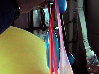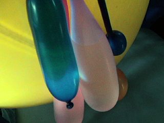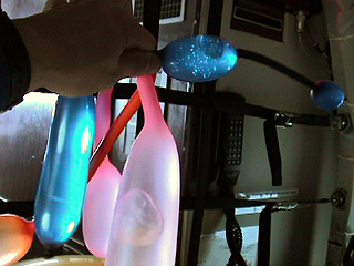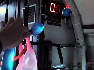 | [ 実験内容 ] 児童用の小さなスティック風船に水と空気をいれて生物的な形状にしたもの4点を手にもって浮遊させる。他方の手でビデオ撮影。 [ 使用した材料 ] 児童用のスティック風船4点(青、黄、ピンク、緑) 水 [ 実験結果 ] 約1.8〜1.9Gになった際には床方向に大きくひっぱられ、μGへの移行の際にその反動で浮かび上がって波打つように運動した。カラフルな形態がからまりながら浮遊しているさまは造形的にも興味深い現象であった。 風船内部の空気が球形になって風船内の水中にある状態が撮影できた。しかし片手で撮影し、片手で風船の端をもつという体勢にあったこと、20秒足らずという短い時間であったことから、この現象のさらなる造形的可能性を追求することはできなかった。 - QuickTime Movie: 水入りスティック風船 #1 (5,388K) >> (下) 撮影ビデオより 実施者: 井上明彦 撮影: 井上明彦 2001.11.15 |
