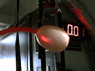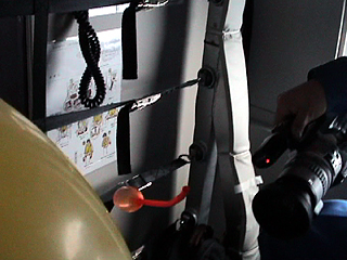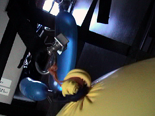 | [ 実験内容 ] B-i-2と同じ実験であるが、今回は風船を手から離して自由な運動を見ることを目的にした。他方の手でビデオ撮影。 [ 使用した材料 ] 児童用のスティック風船4点(青、黄、ピンク、緑) 水 [ 実験結果 ] 手放した風船は、浮遊状態に留まることなく臨席の床の方に飛んでいってしまった。シャトルやISSとちがって、パラボラ飛行を繰り返すμG体験飛行では、物体にさまざまな方向の力が働いて、一定の浮遊状態をとどめることは困難である。 - QuickTime Movie: 水入りスティック風船 #2 (3,992K) >> (下) 撮影ビデオより 実施者: 井上明彦 撮影: 井上明彦 2001.11.15 |
