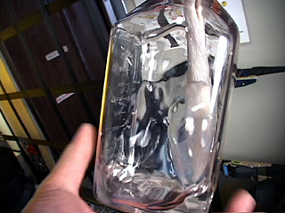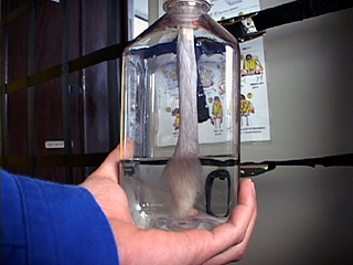 | [ 実験内容 ] 水の濡れ性を利用して、芯材となる濡れた細長い毛皮に水を付着させることで水の変形保持を試みる実験。 1. ボトルに約400mlの水を入れる。 2. 毛皮はあらかじめ水で湿らせた後、ボトルのキャップ部分からまっすぐ垂らす。 3. 毛皮の先端はボトル底部に接している。 4. 毛皮の約3/2は水に浸されていて、その部分の毛皮は水中で広がっている状態。 5. ボトルの上下を維持した状態で手に持ち、そのまま微小重力状態に移行。 ビデオによる記録撮影。 [ 使用した材料 ] 透明プラスチックボトル size: 90mm x 90mm x 220mm(h) (max. 1000ml) 帯状の毛皮 size: 220mm(l) x 30mm(w) 水 約400ml [ 実験結果 ] 当初の予想では、微小重力に移行時に毛皮が水を吸い上げて膨らみ、"Wet Fur Ball"状になることを期待したが、挙動を明確に観察することはできなかった。撮影ビデオでの実施後の確認においても、それらしき状態と推測される瞬間もわずかながらあったが不明瞭であり、確定するには至らなかった。水は容器の中をぐるぐると這い回り、毛皮に集まるよりも容器の壁面に多く付着する結果となってしまった。容器内の水の量が多すぎたとの指摘あり。 また、今回は微小重力状態が不安定かつ短時間であったことをはじめ、その前後のGの変化や手で保持することによる振動などさまざまな排除されるべき要因が含まれていたが、これが安定した微小重力環境下での実験であったとしても、そもそもこうした現象を生じさせる可能性があるのかどうかについて今後更なる検討を要する。 - QuickTime Movie: Wet Fur Ball in The Bottol #1 (5,994K) >> (下) Wet Fur Ball プラン図 |