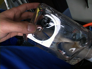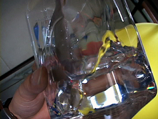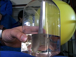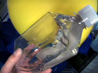 | [ 実験内容 ] B-n-1と同様の実験を再度実施した。ビデオによる記録撮影。 [ 使用した材料 ] B-n-1と同じ 透明プラスチックボトル size: 90mm x 90mm x 220mm(h) (max. 1000ml) 帯状の毛皮 size: 220mm(l) x 30mm(w) 水 約400ml [ 実験結果 ] B-n-1での結果が不明瞭であったため再度同様の実験を行ったが、B-n-1で指摘した要因とともに微小重力時のGが安定しなかったこともあり実施はうまくいかず、期待した結果を得ることはできなかった。 - QuickTime Movie: Wet Fur Ball in The Bottol #2 (6,812K) >> (下) 撮影ビデオより 実施者: 中原浩大 撮影: 中原浩大 2001.11.15 |