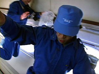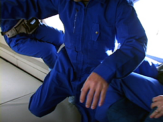 | [ 実験内容 ] 『宇宙医学・生理学』(宇宙開発事業団編 1998)に掲載のあった「中立姿勢」を参考に、微小重力下での弛緩の姿勢を試みる。ビデオによる記録撮影。 [ 使用した材料 ] 特になし [ 実験結果 ] この実験は特別な道具を用いないで、「ただ浮遊する状態」を体験しようとしたもので、道具と身体行為の組み合わせによるA-2,3,4,5,6の実験との比較上重要なものだったが、弛緩の姿勢をとることは予想以上に難しくうまく体験することができなかった。実施者にとって初回のパラボリックフライトでの実施であったこともあり、微小重力状態の時間的制約(約20sec.)の感覚がつかみきれなかったことや、不馴れもあった。 - QuickTime Movie: 弛緩のポーズ (5,712K) >> (右) 「中立姿勢」 出典: 関口千春他著『宇宙医学・生理学』宇宙開発事業団編 1998 (下) 撮影ビデオより 実施者: 中原浩大 撮影: 井上明彦 2001.11.15 |
