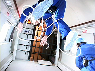 | [ 実験内容 ] スチレンフォーム製のひもを身体にまきつけて、自由姿勢で微小重力を体験する。ビデオによる記録撮影。 [ 使用した材料 ] スチレンフォーム製のひも size: 長さ10m、直径約1cm [ 実験結果 ] 微小重力下でのものと身体の動きの違いとその関わりを見るために行なった実験であるが、安全性を考えて用意したひも自体の質量が小さいため、動きによるかたちの変化が乏しかった。また被験者にとってはじめてのμG体験であったため、身体を弛緩状態に保って自由な浮遊状態を維持することが困難であった。 - QuickTime Movie: ひもに絡まる (5,974K) >> (下) 撮影ビデオより 実施者: 井上明彦 撮影: 中原浩大 2001.11.15 |