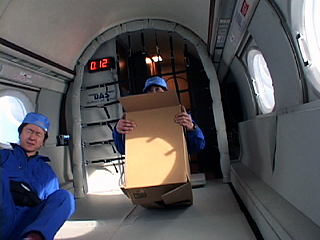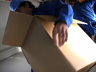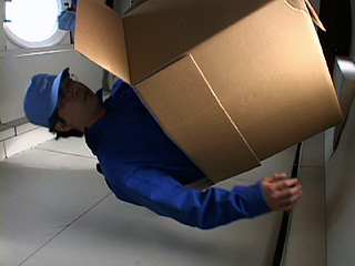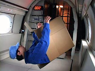 | [ 実験内容 ] 段ボール箱底部は閉じ、上部の蓋は開いた状態で使用した。床に置いた段ボール箱に両膝を立てた状態でしゃがみ込み待機し、微小重力を体験する。ビデオによる記録撮影。 [ 使用した材料 ] 段ボール箱 size: 54cm(d) x 36cm(w) x 50cm(h) [ 実験結果 ] 段ボール箱の内壁に足や下半身を押し付け踏ん張れることは、意外にも安心感と結びついた感覚があった。安心感は微小重力状態への移行時、微小重力時それぞれに感じることができるが、特に移行時の印象は強かった。また、至近距離に体を接するものとともに浮遊することは、フリーの状態での浮遊に比べ、主観的な身体軸に引きずられ、客観的な上下関係を探ろうとするジレンマを放棄する感覚もあった。 - QuickTime Movie: 段ボール箱に乗り込んで (5,214K) >> (下) 撮影ビデオより 実施者: 中原浩大 撮影: 井上明彦 2001.11.15 |