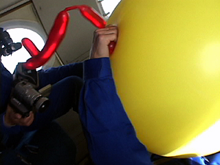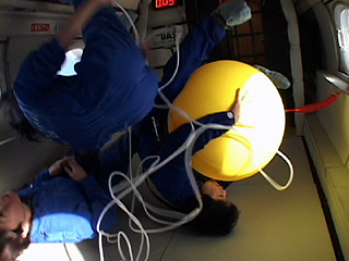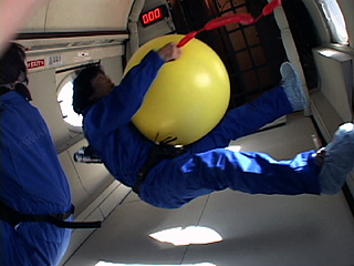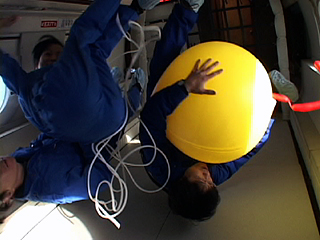 | [ 実験内容 ] ゴム風船を抱えると同時に、水を入れたスティック風船を手に持ち、微小重力を体験する。ビデオによる記録撮影。 [ 使用した材料 ] A-4で使用したゴム風船 size: 直径 約80cm、黄色 水を入れたスティック風船 size: 長さ約50cm、赤色 [ 実験結果 ] 身体、ゴム風船、水入りスティック風船という質量の異なる物体のμG下での動きを記録するために行なった実験。風船を抱え込んで身体を丸めていたためか、回転運動が生じ、スティック風船が遠心力で大きくのびた記録映像を撮影できた。 - QuickTime Movie: 風船と水入り風船をもって (5,156K) >> (下) 撮影ビデオより 実施者: 井上明彦 撮影: 中原浩大 2001.11.15 |