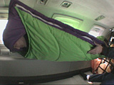 | 試作した FUTON “空気に包まれるひと”による身体感覚の体験を中心とした予備的実験。 (下) 撮影ビデオより 実施者: 池上俊郎 2003.3.22 |
