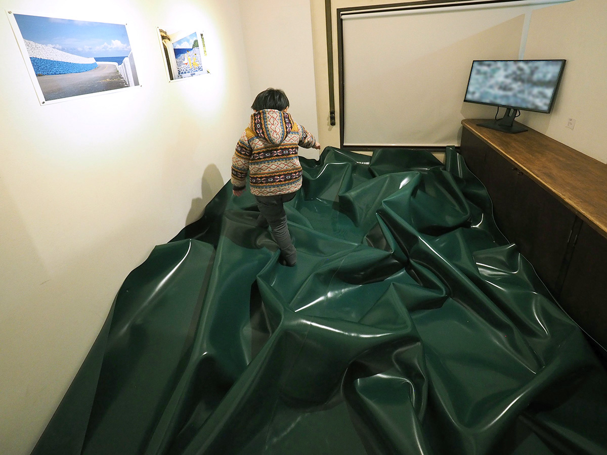 "Three Horizons" consists of two parts; on the floor, "Invisible Ground", on which one can walk on the bumpy ground of wooden mountains covered with water-shielding-sheet for the storage area of radioactively contaminated soil of Fukushima. There is one "lake" filled with real water which makes a small horizon on the rough ground.