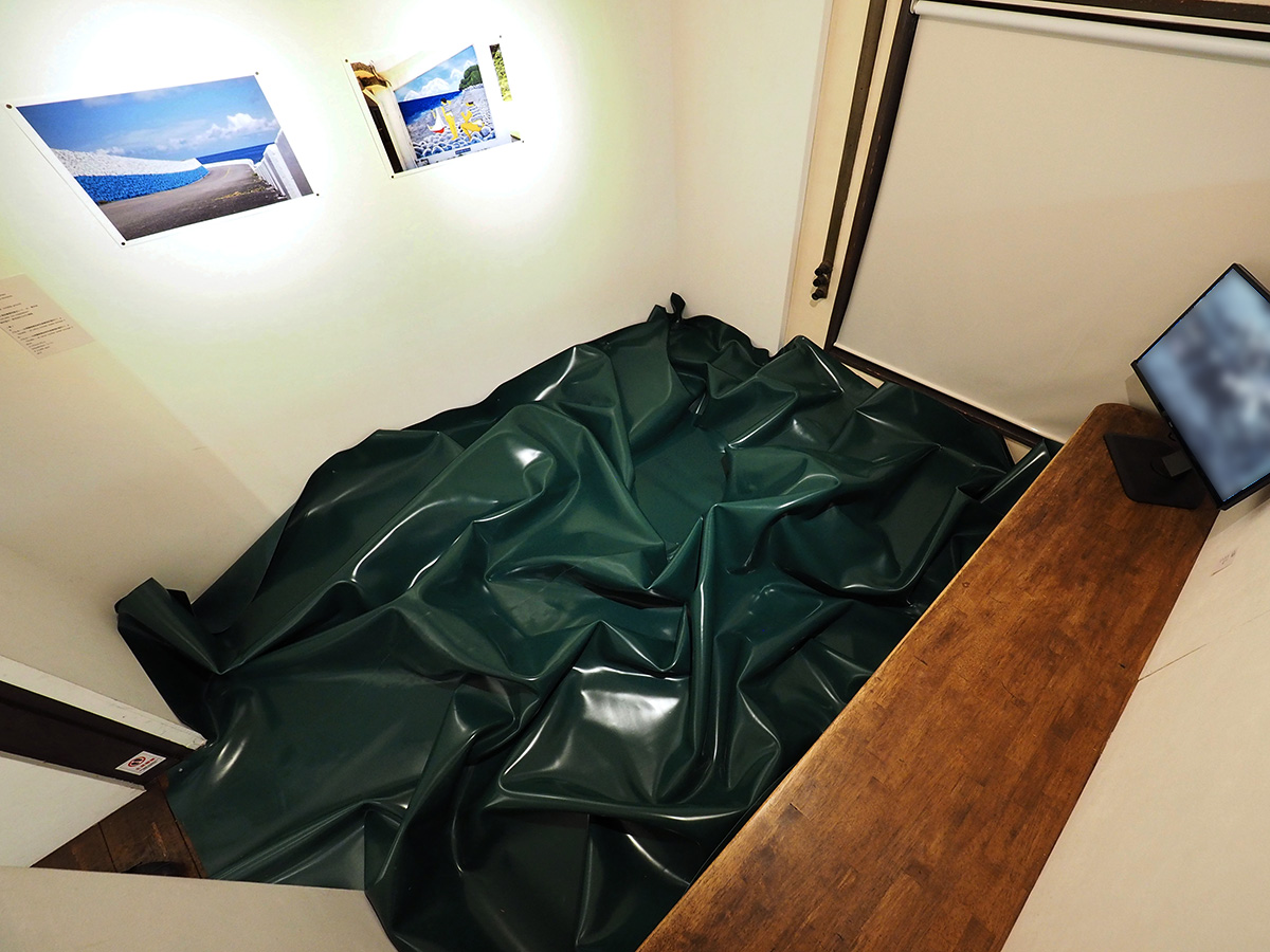 床の『見えない大地』は、福島の大地の起伏を示唆する凹凸に富んだ木製の地面の上を、現地の汚染土壌仮置場にかぶせられる緑色の遮水シートが覆う。皺は展示室の床よりシートが大きいために自然に生まれた皺である。凹んだ部分の一部には実際に水がはられ、湖を示唆する。人は靴を脱いで上を歩くことができる。